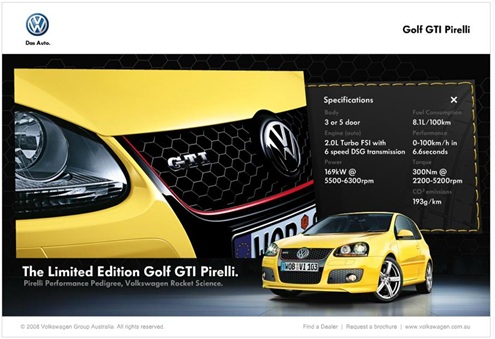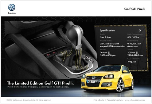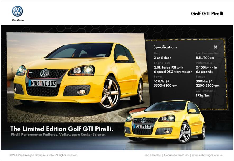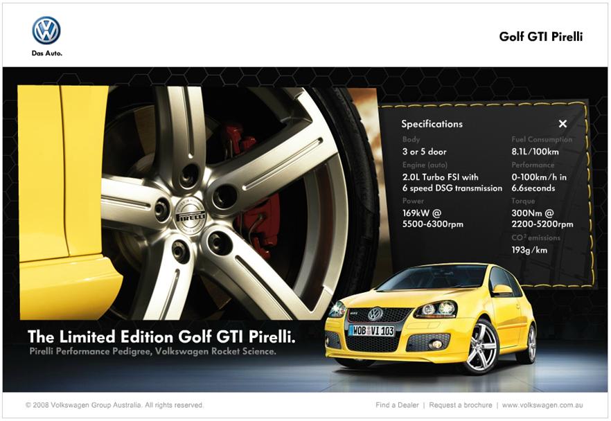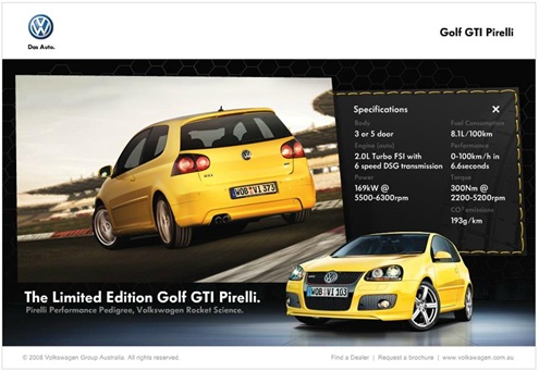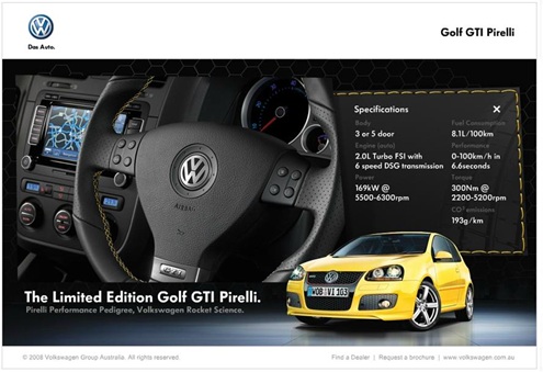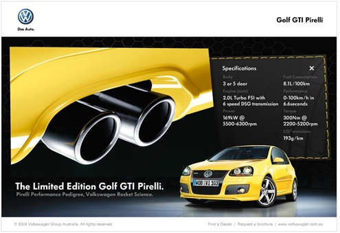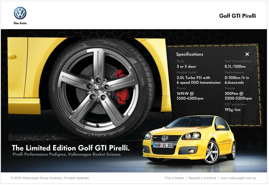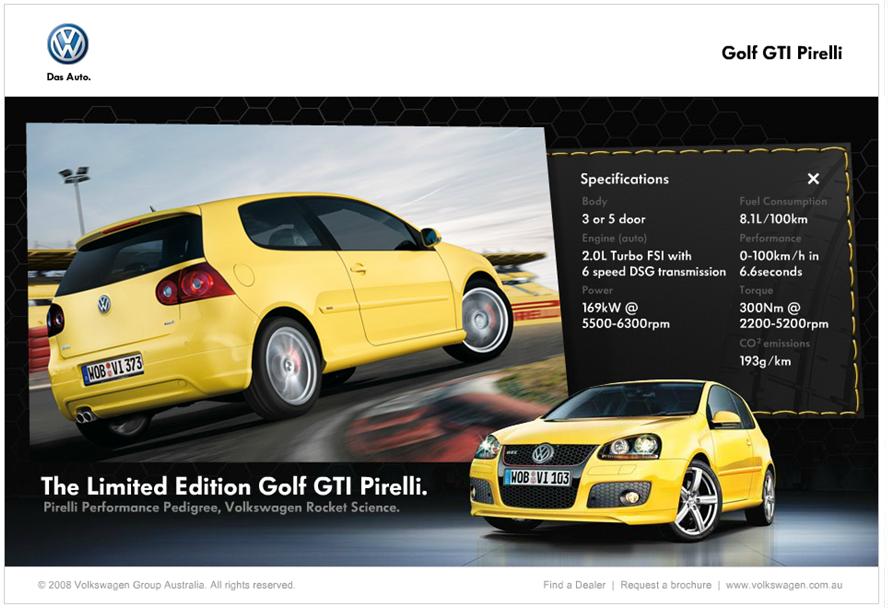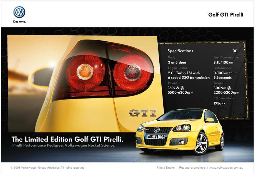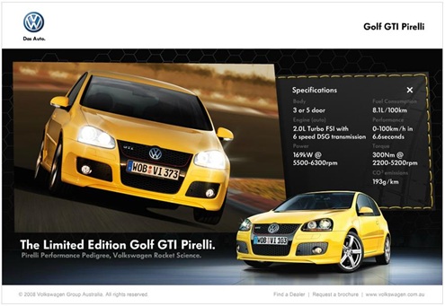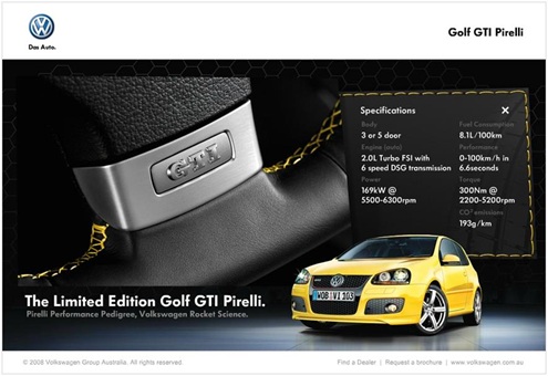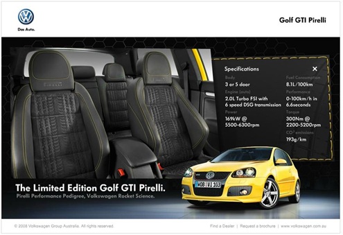 For 2008 the GTI Pirelli returns to the UK. Based on the MkV GTI bodyshell the new vehicle features uprated dynamics and aesthetics to distinguish it from the standard car.