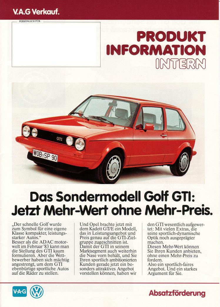 Interne Produktionsinformation zum Sondermondell Golf 1 GTI "Pirelli", ein interne Verkaufsprosekt mit einem Vergleich der Mitbewerber