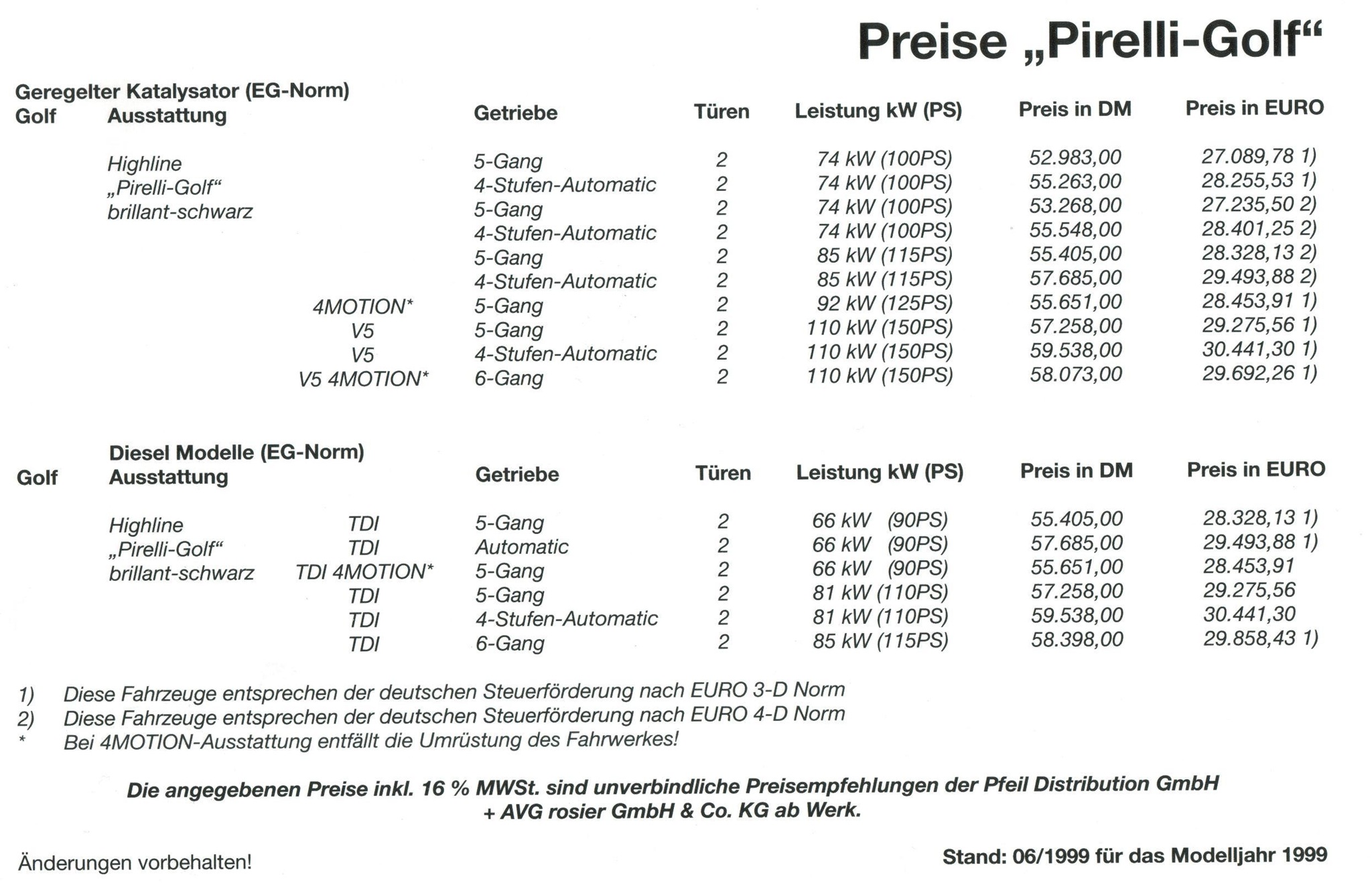 1999 wurde ein 4er Golf als PIRELLI Golf umgerüstet. Dieser "Pirelli Golf" auf Vierer-Basis ist einigen wenigen in der Scene bekannt.