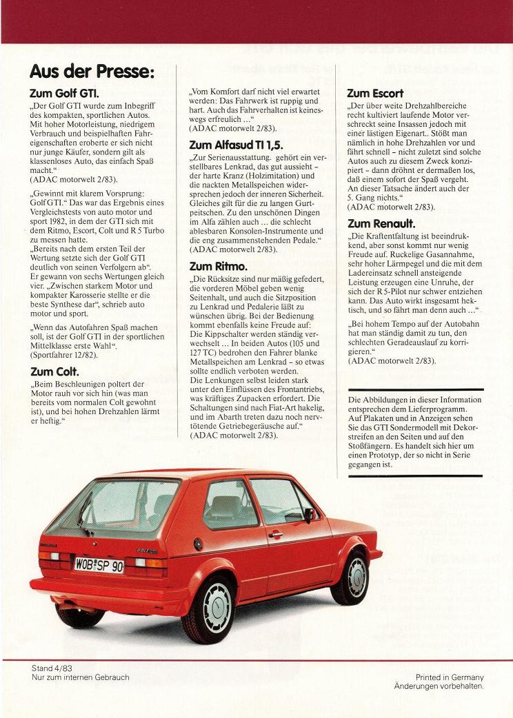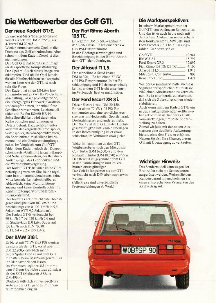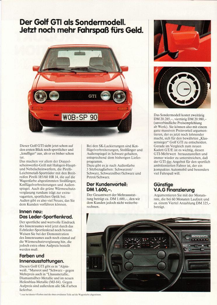 Interne Produktionsinformation zum Sondermondell Golf 1 GTI "Pirelli", ein interne Verkaufsprosekt mit einem Vergleich der Mitbewerber